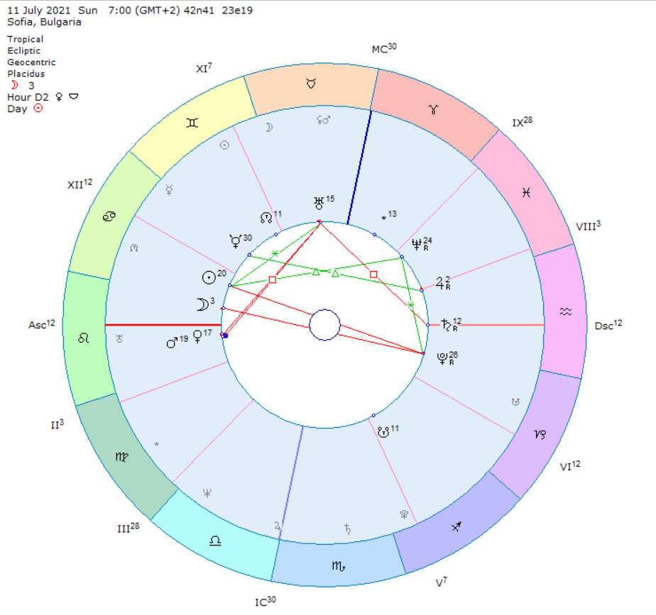 - Слънцето да е в ъглов дом или поне в следващ – НЕ е изпълнено, Слънцето е в кадентен дом, който се счита за неблагопроятен, за дом на скритите неща, на тайните врагове, на изолацията.
